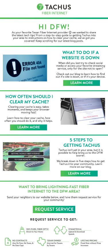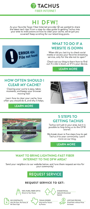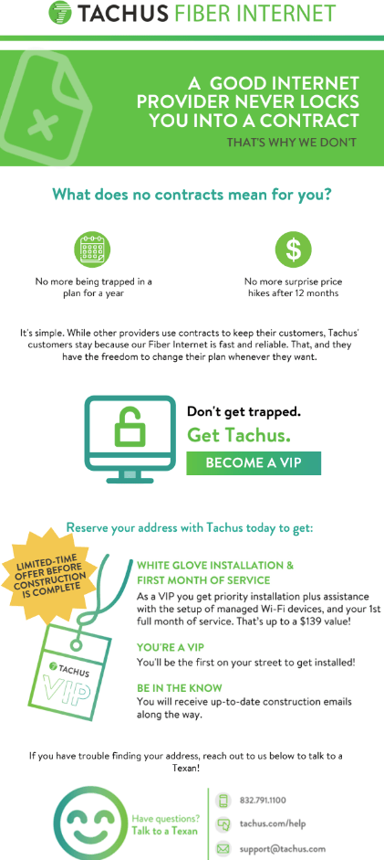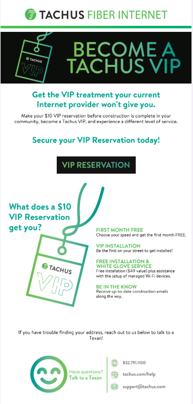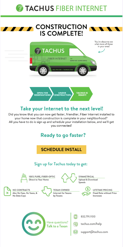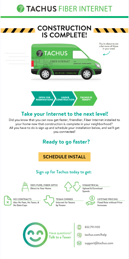 The following templates are part of an entire email journey built out for Tachus Fiber Internet. Tachus now has a robust, automated email cadence that generates and nurtures leads, calls them to action, guides them through transactions, keeps them engaged, and collects their feedback.